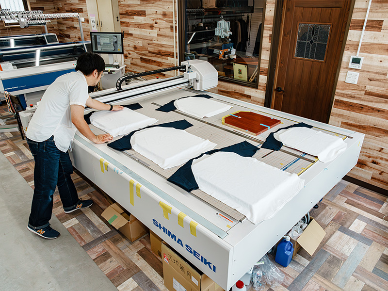 縫製だけでなく、製品プリント、原反プリント、刺繍、ホールガーメント設備があり、洗い仕上げ設備も完備しているため、自社一貫のスピーディな生産が可能